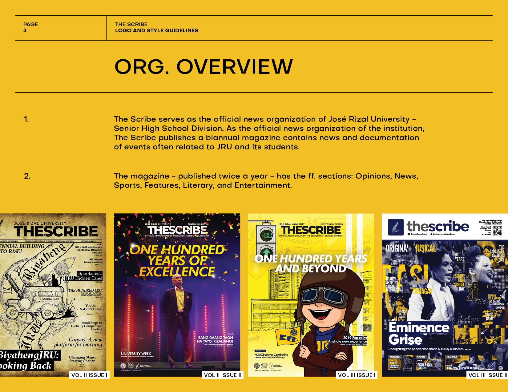 I developed The Scribe’s official Logo and Style Guidelines, a comprehensive manual defining the publication's brand architecture. This document codified the primary color palette (Navy, Gold, and Bronze), typography usage, and logo clear-space rules. This system transformed the publication from a collection of loose layouts into a recognizable, cohesive brand entity for the Jose Rizal University Senior High School division.